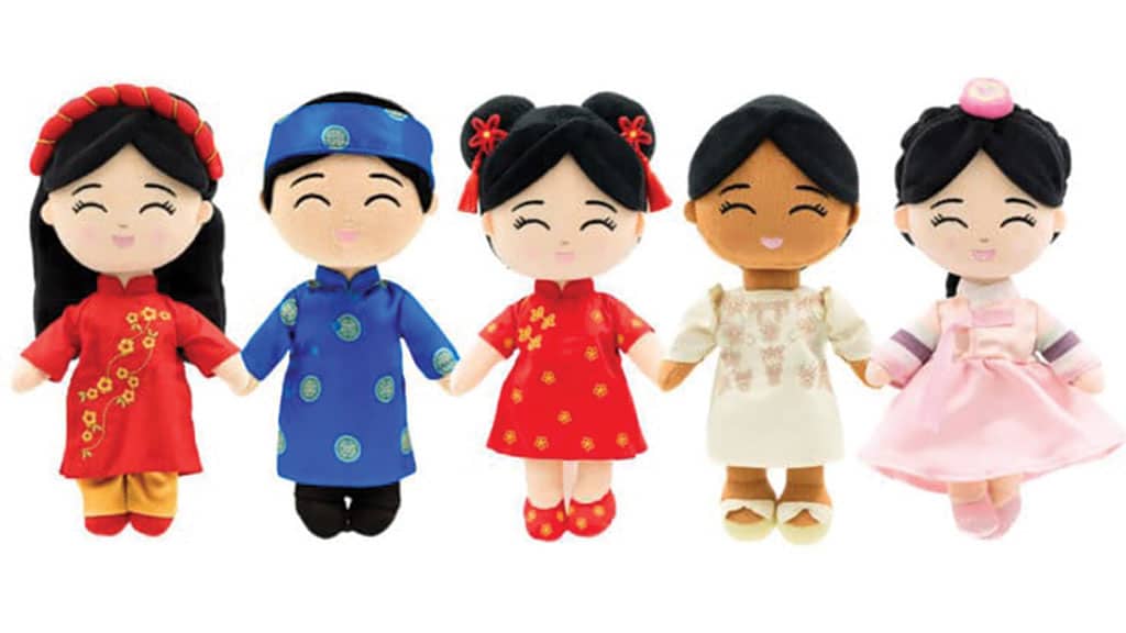 Designed by an Asian mom, this line features five 9-inch plush dolls celebrating Vietnamese, Korean, Filipina, and Chinese heritage with traditional clothing and huggable bodies.
