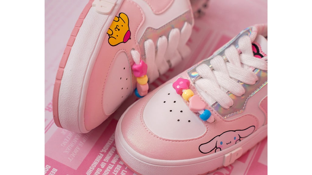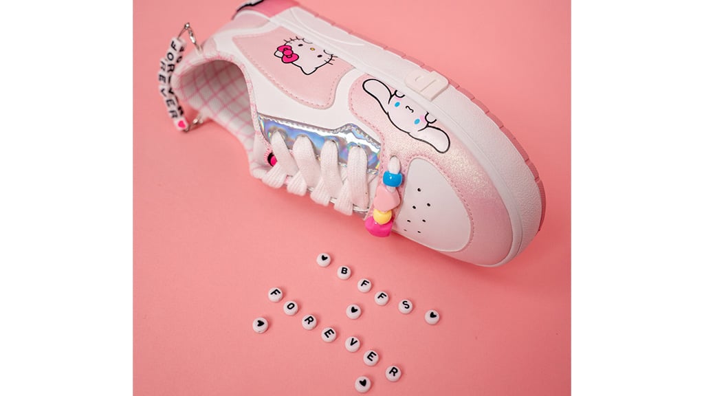 Make Sanrio steps with sneakers inspired by Hello Kitty and Friends. Across each iridescent pink sneaker, fans can find graphics of Hello Kitty, Kuromi, My Melody, Cinnamoroll, and Pompompurin. The shoes also feature friendship bracelet accessories, lace charms, and Sanrio-inspired details.