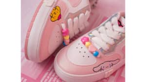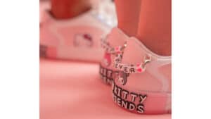 Like Hello Kitty, these shoes are all about friendship. Along with images of the Sanrio pals, these shoes have friendship bracelet accessories on the heels. Each shoe features a “Forever” beaded bracelet, which sits above letter accents that read “Hello Kitty and Friends.” The sneakers also feature charms on the front laces, adorned with colorful beads in the shape of hearts and stars.