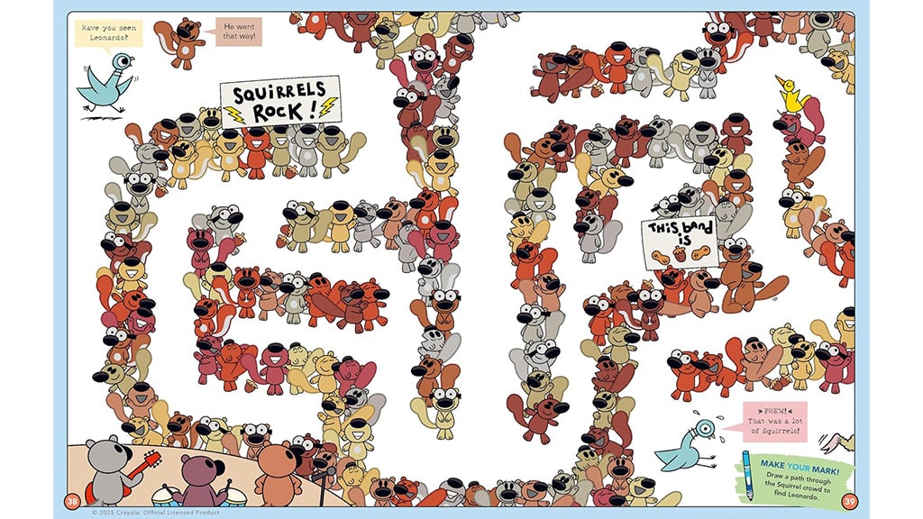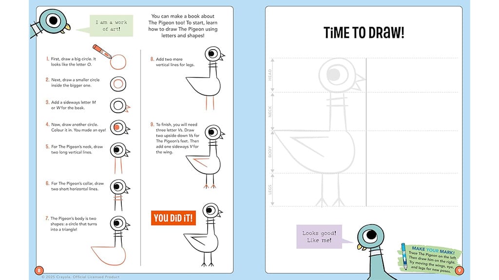 The book features more than 100 activities for kids to enjoy, like learning how to draw The Pigeon, navigating a squirrel maze, solving puzzles, and coloring comic book-style pages. Each page also encourages kids to try new ways to express themselves, such as writing, cooking, dancing, and creating their own art. The book also includes 50 stickers and a pull-out poster for kids to color and display in their rooms. The included double-sided Crayola markers match the color palette that Willems uses for his characters.