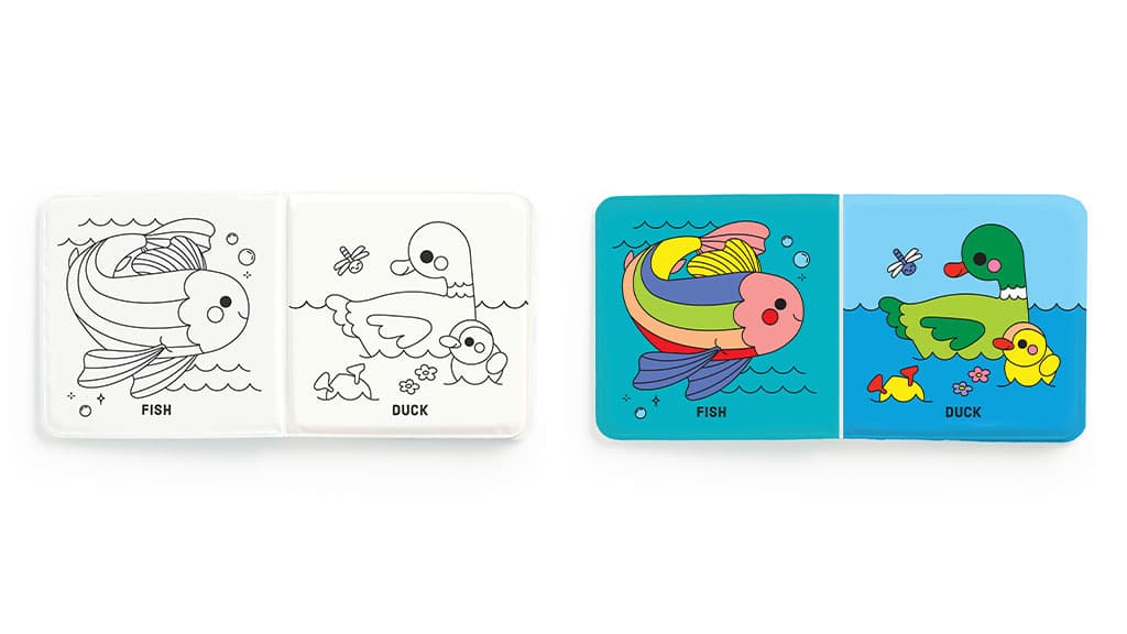 This waterproof book features friendly pond animals and pages that burst into color when in water.