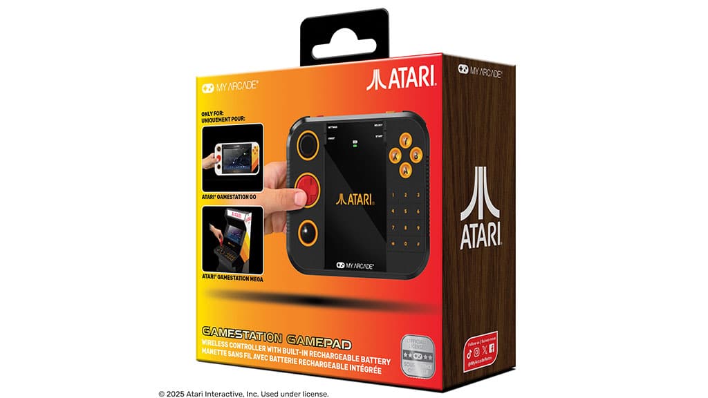 The Atari Gamestation Gamepad is a rechargeable, wireless controller with more than 12 hours of play time. SmartGlow control illumination technology tells players which buttons work best for each Atari game. The free-spinning paddle, numeric keypad, bumpers, and trackball offer versatile gameplay.