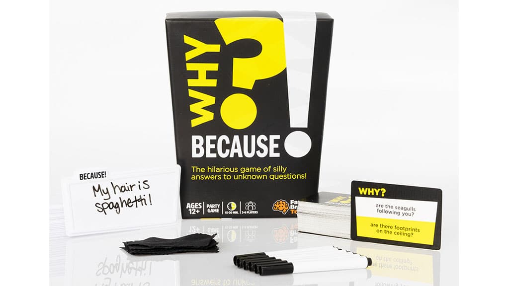 In this party game, players answer “Why?” questions with silly “Because” answers written on a dry-erase board. The funniest answer wins the round.