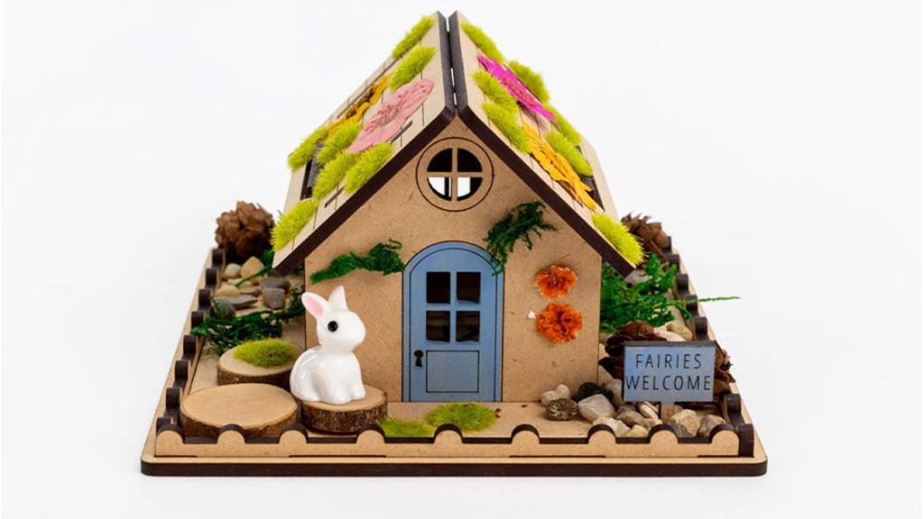 This whimsical Fairy House Model Building Kit includes pre-cut wooden pieces for easy, straightforward assembly and add-on accessories like moss, stones, a bunny figure, and more.