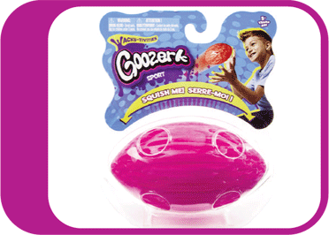 GOOZERK SPORT, 5+ These soft, squishy footballs and baseballs make wacky noises while flying through the air. The aerodynamic holes make it easy to throw and make a loud splat with each catch. They also float on water. SPIN MASTER, www.spinmaster.com