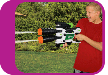 View and shoot around corners with the blaster’s targeting scope and rotating barrels. Turn the side dial to split the barrels for a multidirectional shot, simultaneously spraying opponents at different angles. Water blasts up to 25 feet.