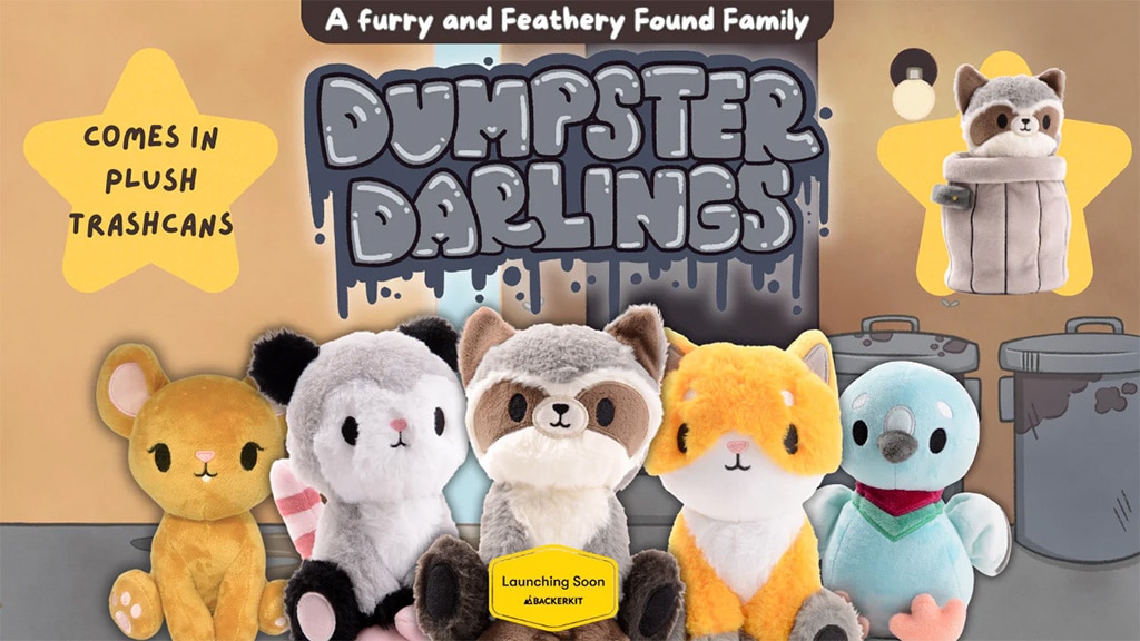 Meet Edgar the Raven, Robby the Raccoon, Petunia the Opossum, Finley the Fox, Olivia the Rat, and Bernard the Pigeon. Each of these 7-inch plush sit comfortably in their own trash cans.