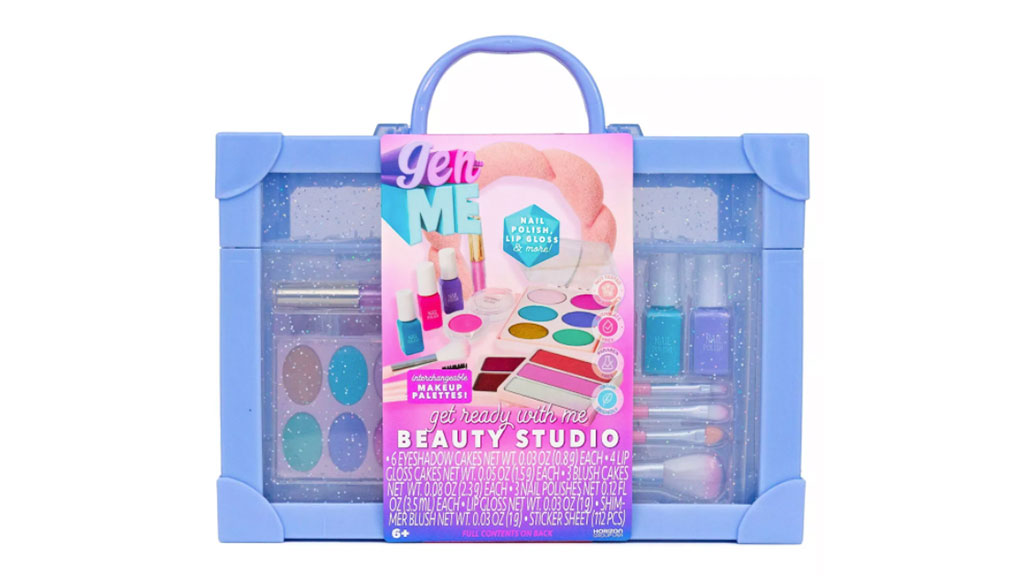 Kids can glamorize their routine with this GRWM kit. It comes with a puffy pink headband, six eyeshadows, a shimmery blush, lip gloss, nail polish, and other accessories.
