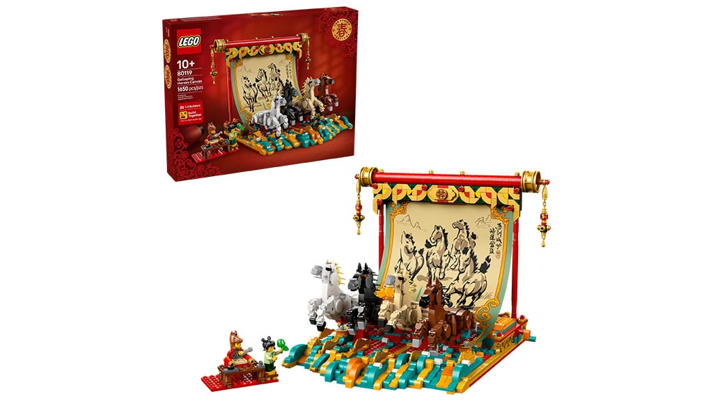 Celebrate the Year of the Fire Horse with this 1,650-piece set. The build features a printed canvas, a scene with two minifigures, and brick-built horses that “gallop” when the handle is turned.
