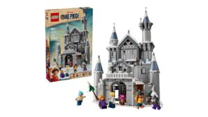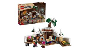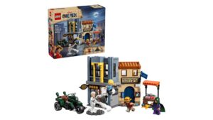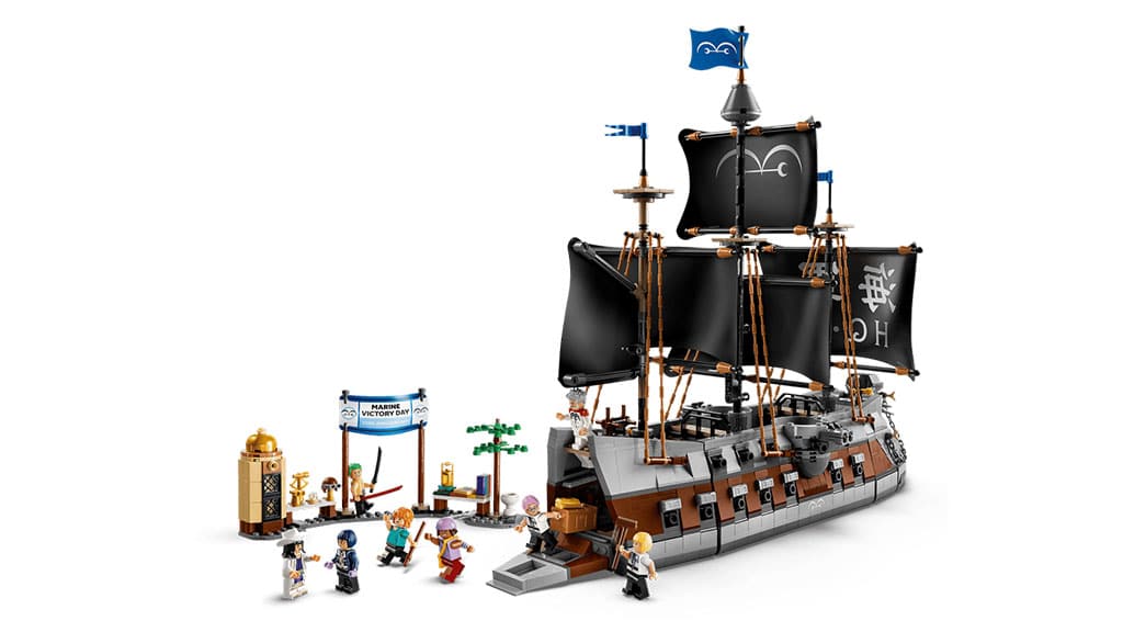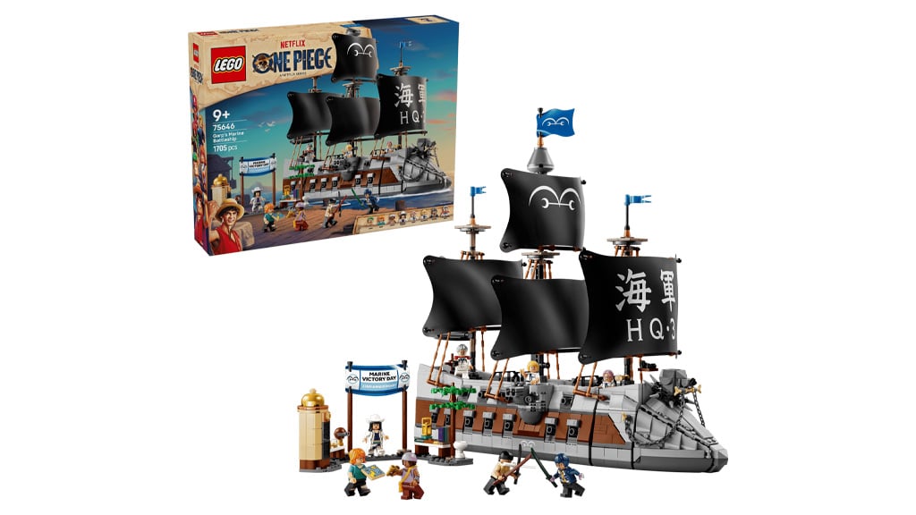 Kids can display Garp’s Marine Battleship with this 1,705-piece set. The marine’s ship includes a dog figurehead, five foil sails, and more. Kids can open the ship’s deck to uncover the Garp’s office and the map room. The set’s eight minifigures can hop aboard the ship or battle in the set’s small market scene.