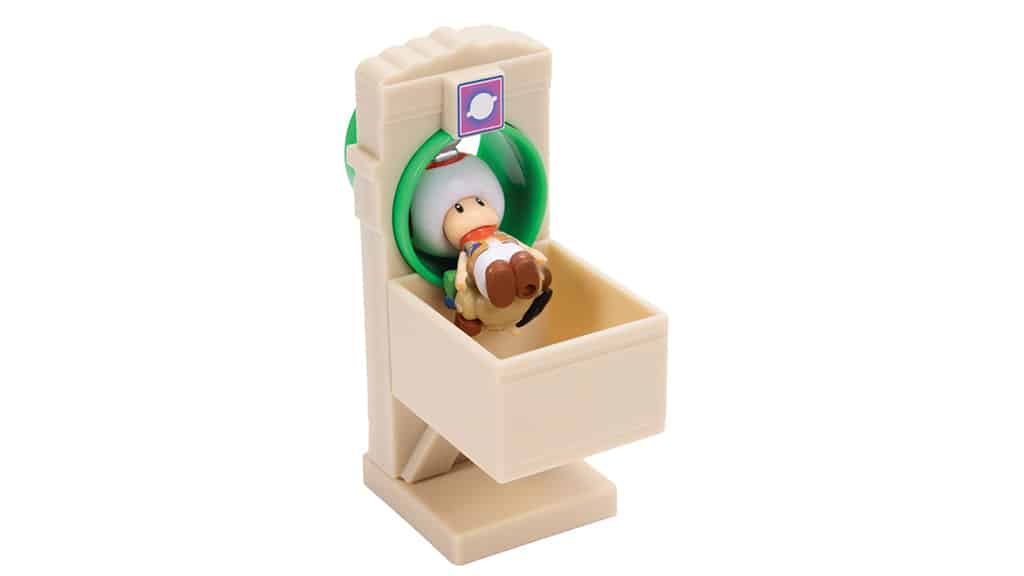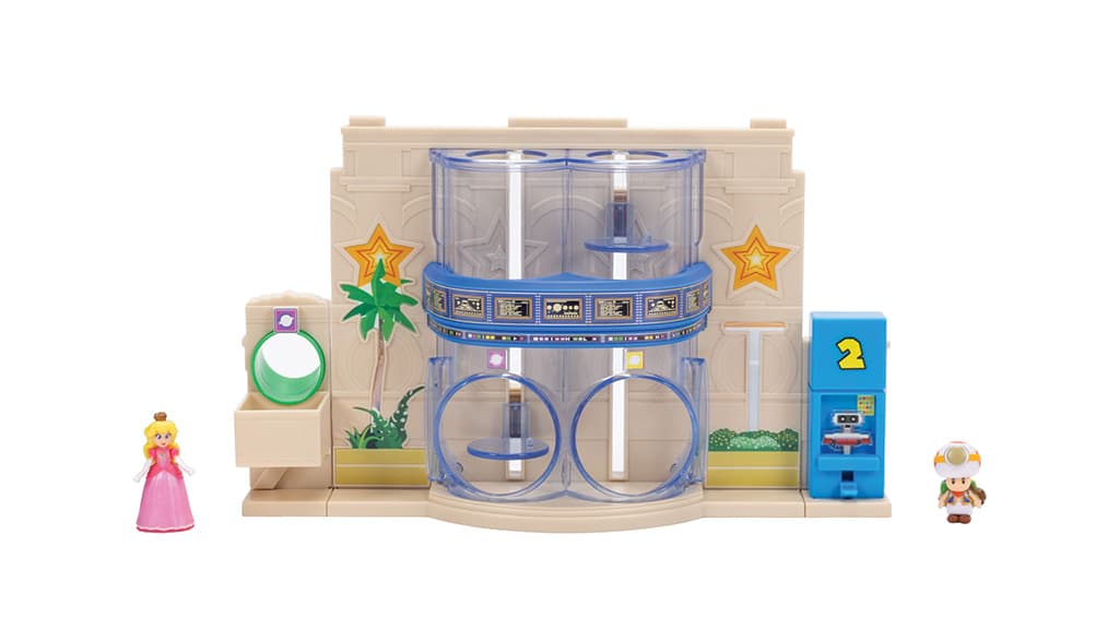 Jump into new Super Mario adventures with this playset! Using the elevators on the backside, Princess Peach and Captain Toad can travel up and down the clear transit tubes. Complete with a warp pipe slide and a panel with R.O.B., this set is a gateway to interplanetary playtime.