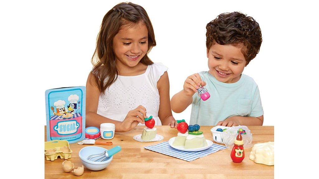Creative Chefs kits let kids play-make their favorite meals using Make-It! Mix, a reusable, moldable sand that mimics real food. Little chefs get to cook with Bluey, encouraging exploration, hands-on learning, and the chance to “adult” in the most fun way possible. Other sets include an ooey-gooey S’mores Set, a multi-course Italian Dinner Kit, and a Bluey Duck Cake set.
