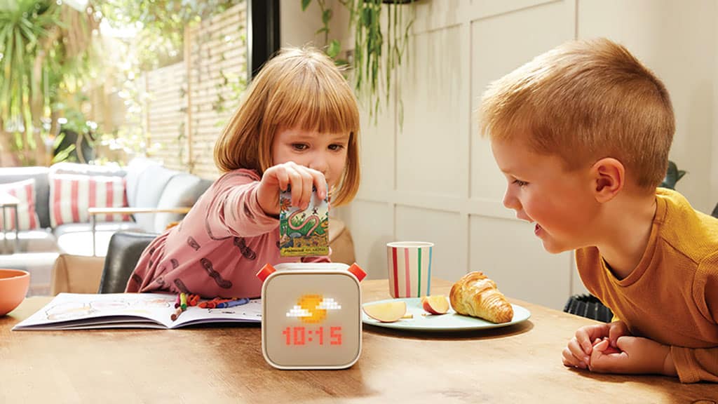 Kids insert an audio card into the slot to hear kid-friendly stories and songs. Along with providing screen-free fun, the device doubles as an alarm clock, a sleep sound maker, a night-light, and more.