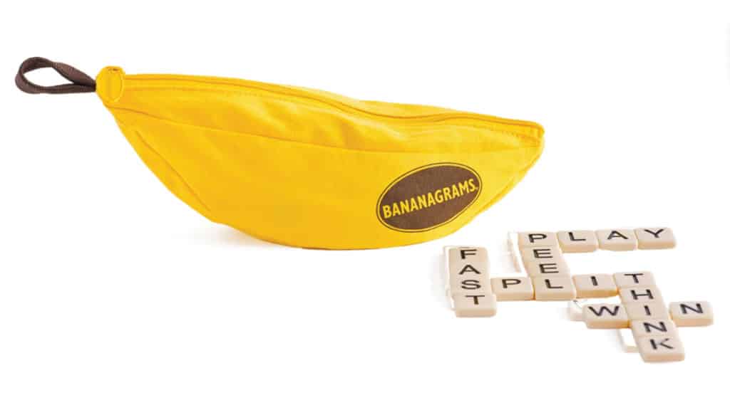 Bananagrams, now from Moose Games, is the iconic word-building game that has been driving players bananas for 20 years. The instantly recognizable banana-shaped pouch holds a ”bunch” of 144 lettered tiles. Players, ranging from one to eight, draw between 11 and 21 tiles (depending on the number of players) and work frantically to create words…