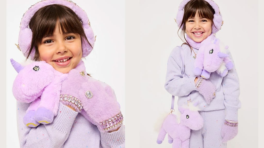 This lineup includes hats, gloves, scarves, earmuffs, plush bags, and other glittering accessories perfect for frosty fashionistas. Whether they’re rocking a playful purple unicorn bag, going wild with a leopard scarf, or sweetening their style with the sugary Cotton Candy collection, these pieces will add sparkle to kids' snow days.