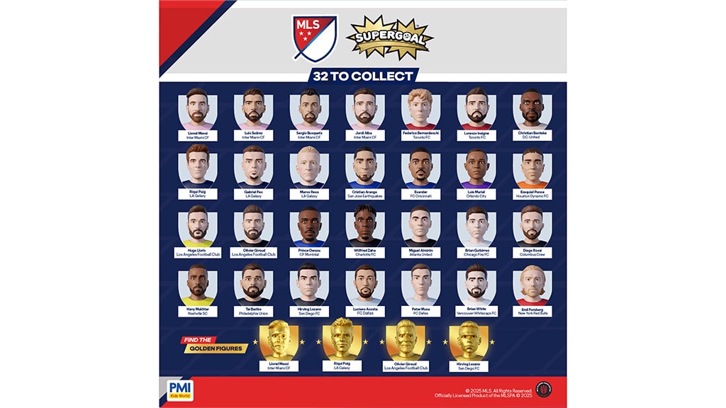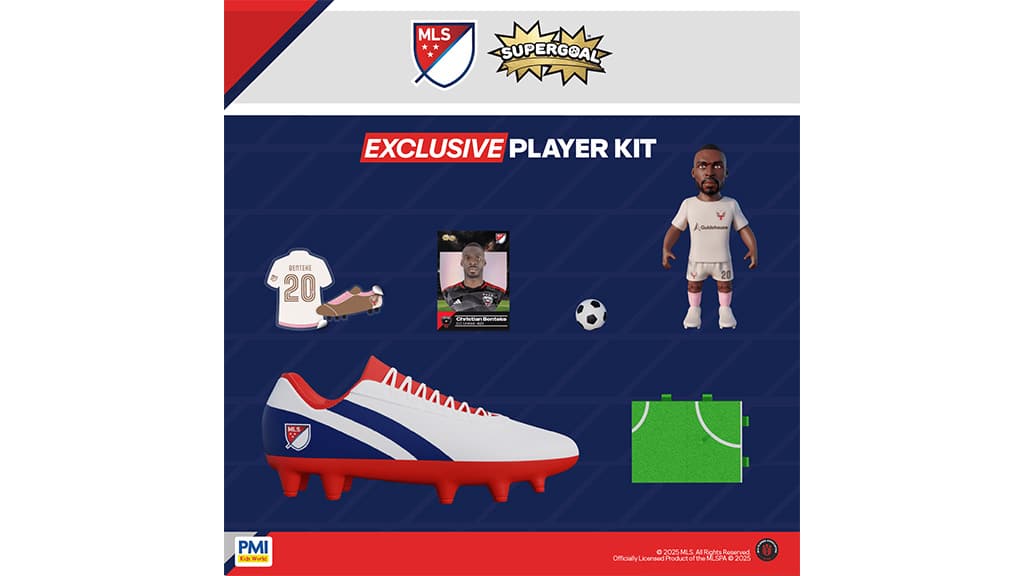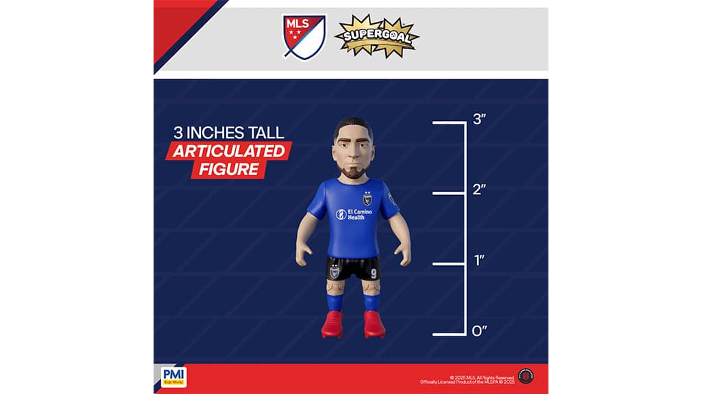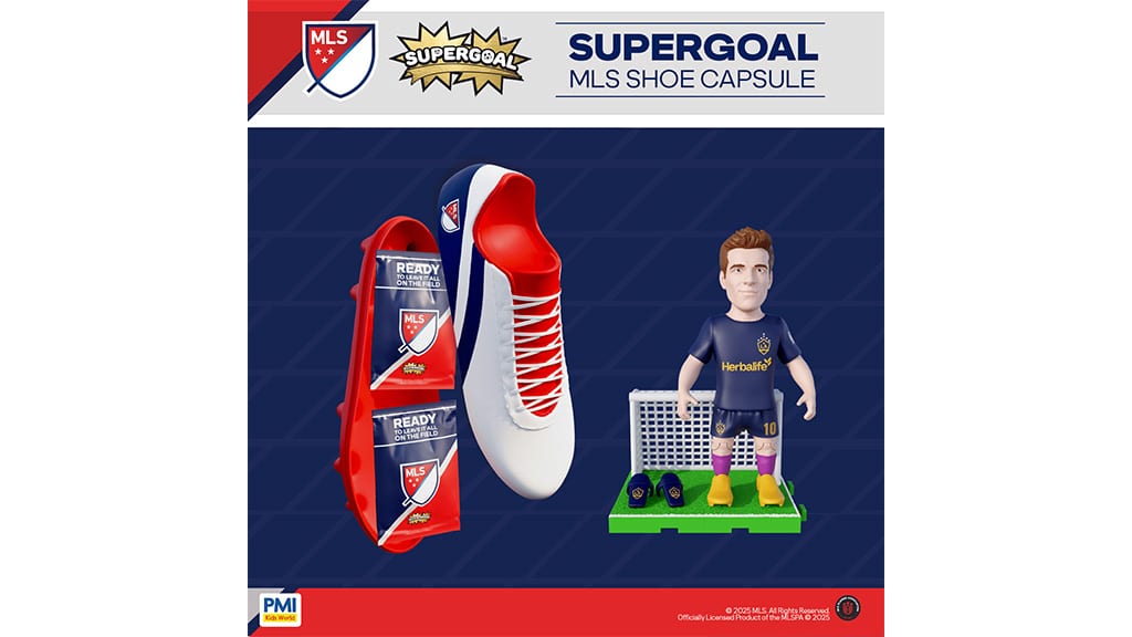 The Supergoal MLS Shoe Capsule is a collectible set featuring a 3-inch articulated soccer player figure, officially licensed by Major League Soccer (MLS). Each figure includes six points of articulation for posing and play, along with a player-specific accessory and a connectable field base that can link with others to build a full pitch. Inside the capsule, kids also discover a mini poster, two stickers, and a collector’s guide. The capsule itself doubles as a display piece, designed to look like a real soccer cleat. The collection includes 28 players and four rare golden figures.
