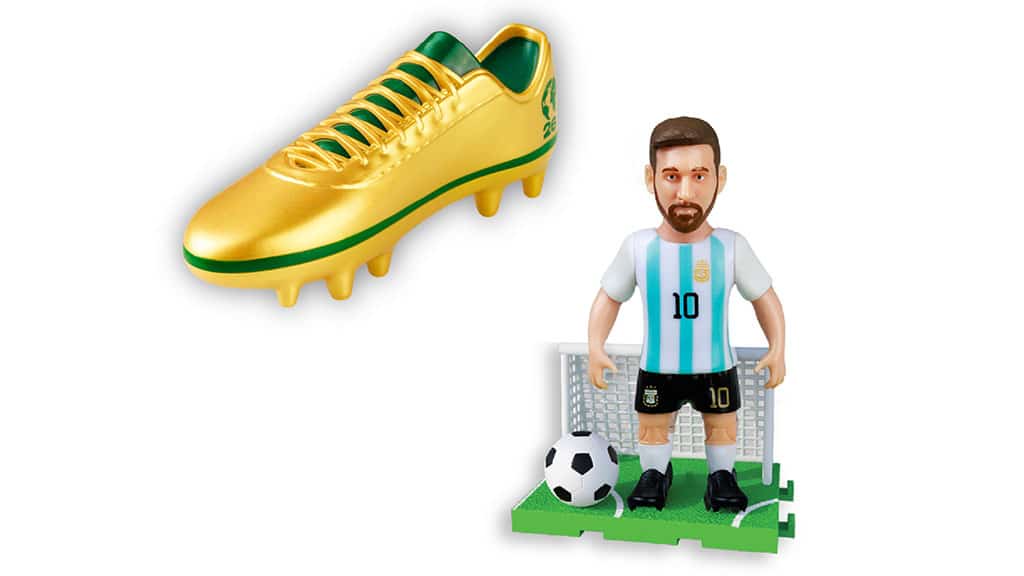Each soccer cleat capsule contains a 3-inch soccer player with six points of articulation. The collectible figure comes with a connectible field base, a player-specific accessory, a mini poster, and two stickers.